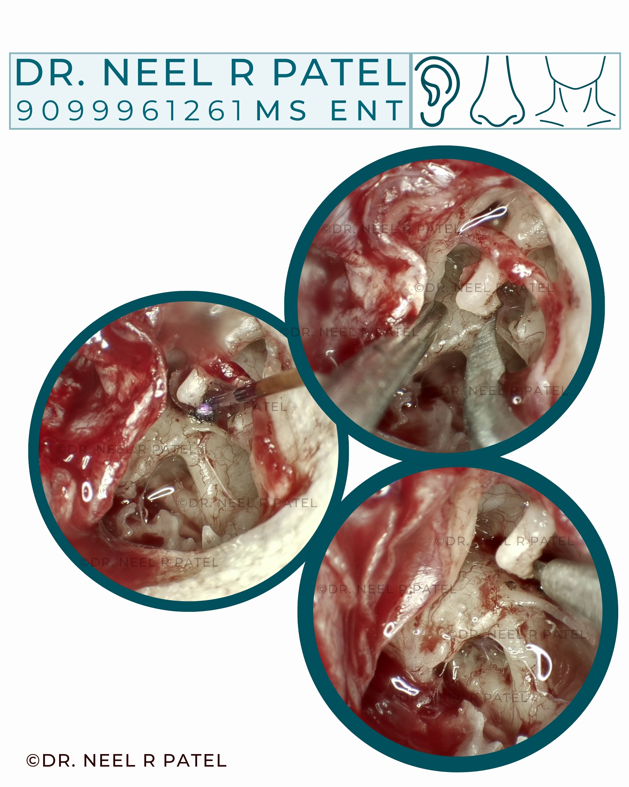 - Visualization: Using an endoscope or microscope, the surgeon carefully lifts the eardrum to expose the middle ear